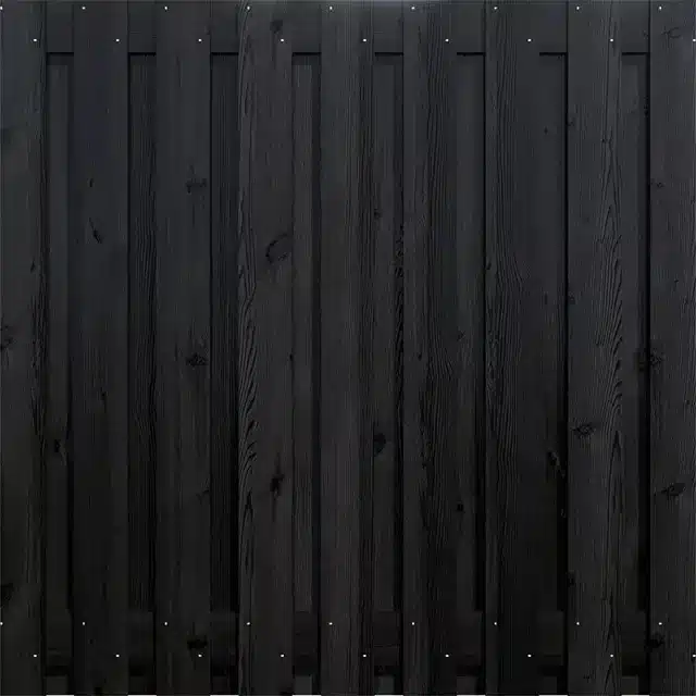 Deze zwart grenen schutting bestaat uit 19 schuttingplanken, waarvan 9 aan de voorzijde en 8 aan de achterzijde. Daarnaast heeft het scherm 2 tussenklampen. Het aantal planken zorgt voor een gemiddelde doorkijk wat betekent dat de houten schutting wel doorkijk heeft, maar zeker ook voor privacy zorgt. Dit scherm is RVS geschroefd, waardoor deze indien gewenst eenvoudig op maat gemaakt kan worden.