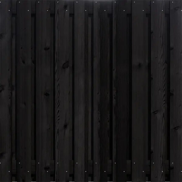 Deze zwart grenen schutting bestaat uit 21 schuttingplanken, waarvan 10 aan de voorzijde en 9 aan de achterzijde. Daarnaast heeft het scherm 2 tussenklampen. Het aantal planken zorgt voor een weinig doorkijk wat betekent dat de houten schutting wel doorkijk heeft, maar zeker ook voor privacy zorgt. Dit scherm is RVS geschroefd, waardoor deze indien gewenst eenvoudig op maat gemaakt kan worden.